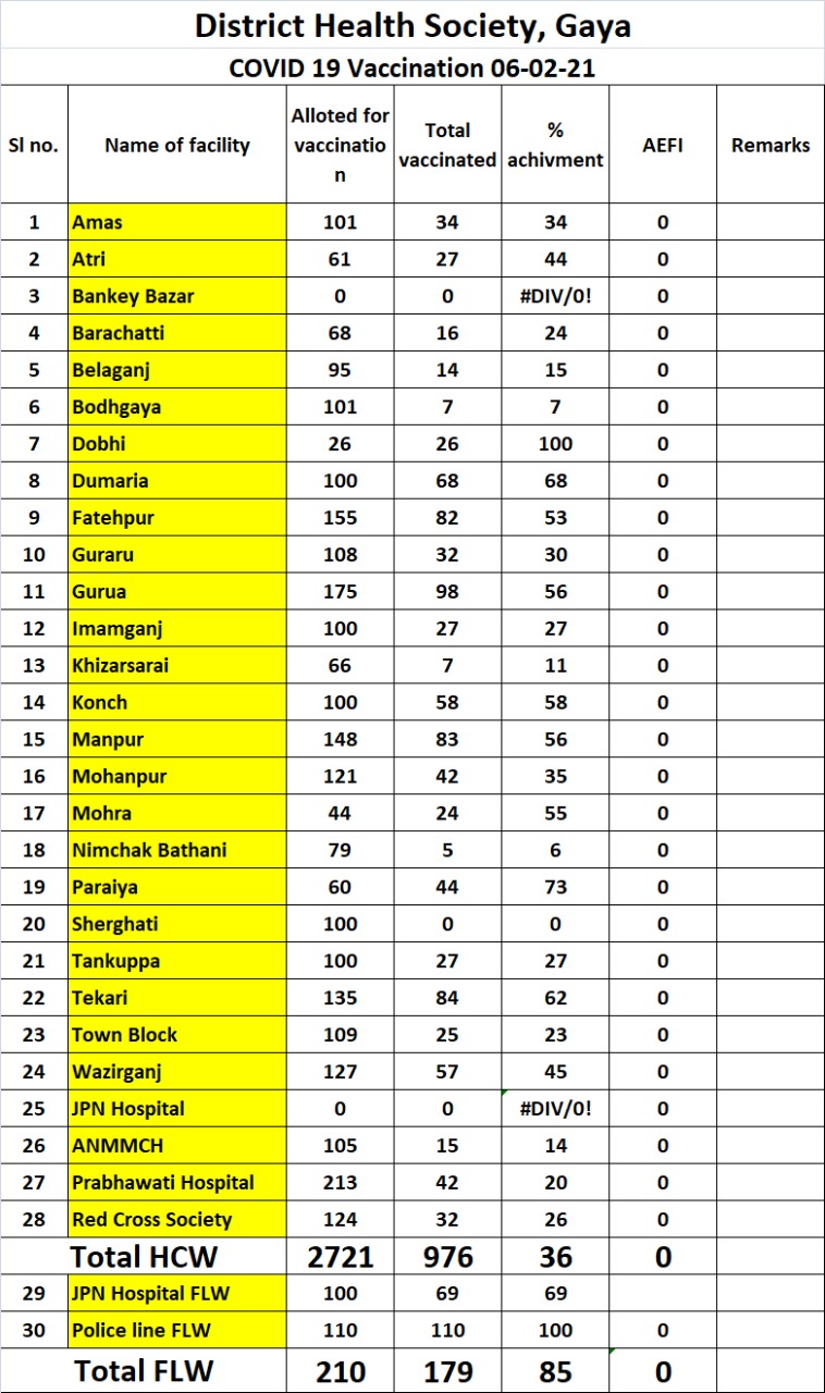 सिविल सर्जन, गया ने कहां की एक दिन में 100 पुलिस पदाधिकारी/पुलिस कर्मियों को टीका लगाने का लक्ष्य निर्धारित किया गया है। इसे लेकर प्रतिदिन लोगों की सूची बनायी जानी है। सूची के अनुसार लाभुकों को मैसेज से टीकाकरण के समय व तारीख की जानकारी दी जायेगी। उसके बाद वे कोविड टीका लेंगे।