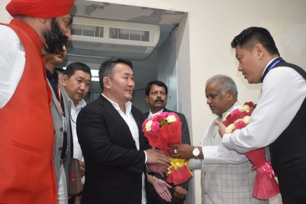 गया : मंगोलिया के महामहिम राष्ट्रपति *खल्तमागीन बत्तुल्ग* के गया के धरती पर आगमन के अवसर पर बिहार सरकार के ग्रामीण विकास विभाग के मंत्री श्रवण कुमार द्वारा पुष्पगुच्छ प्रदान कर उनका भव्य स्वागत किया गया। इस अवसर पर आयुक्त मगध प्रमंडल असंगबा चुबा आओ, मगध क्षेत्र के पुलिस महानिरीक्षक पारस नाथ, जिलाधिकारी अभिषेक सिंह ने पुष्पगुच्छ प्रदान कर तथा वरीय पुलिस अधीक्षक राजीव मिश्रा, विमानपत्तन निदेशक दिलीप कुमार ने हाथ मिलाकर उनका अभिनन्दन किया। इस अवसर पर महाबोधि मंदिर के पुजारीगण खादा ओढ़ाकर कर महामहिम का पारम्परिक स्वागत किया।
