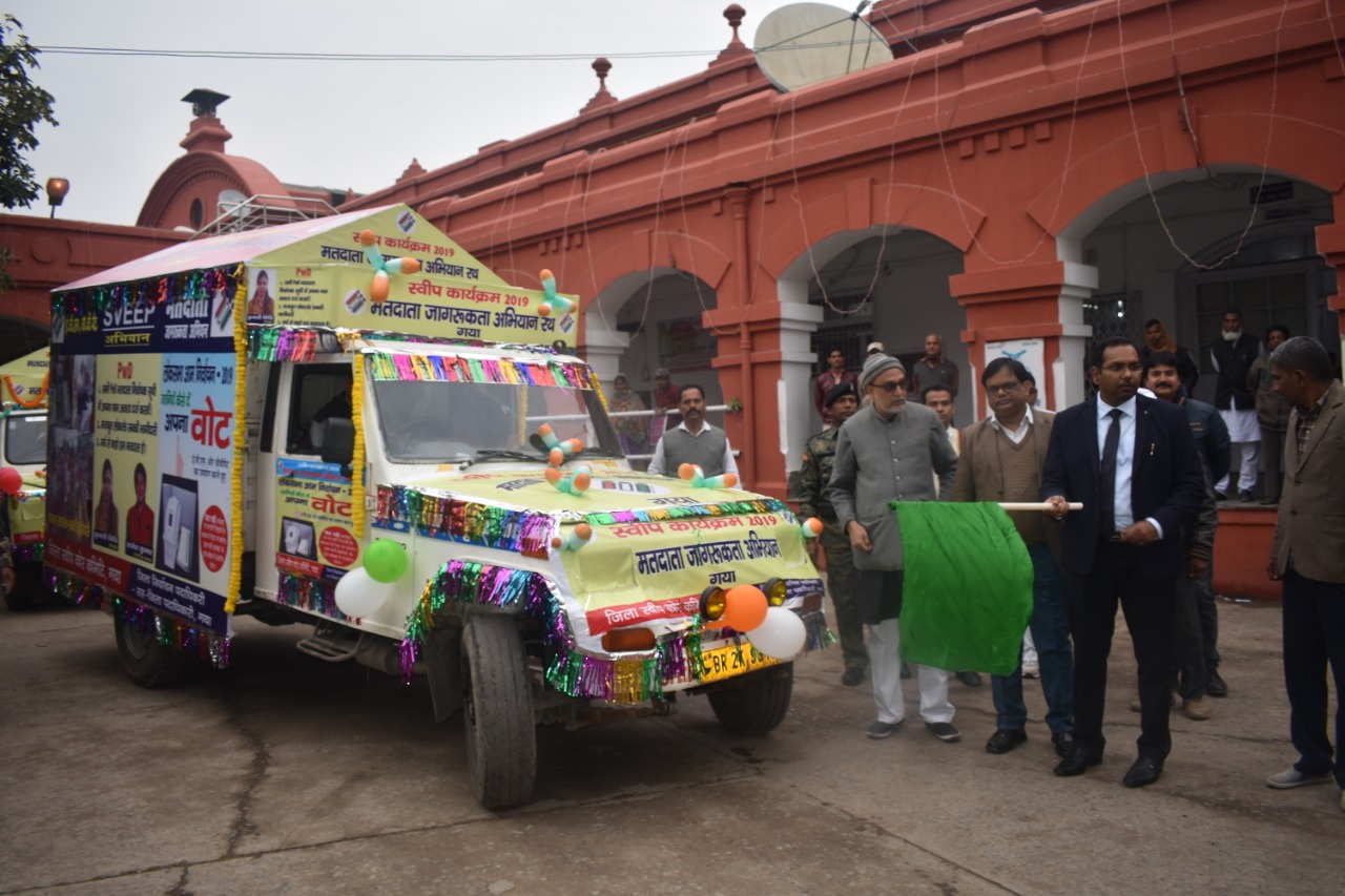 गया : राष्ट्रीय मतदाता दिवस के अवसर पर गया जिला के मतदाताओं को जागरूक करने हेतु तथा अहर्ता प्राप्त युवकों/ युवतियों को मतदाता सूची में नाम जुड़वाने के उद्देश्य से स्वीप अभियान अंतर्गत मतदाता जागरूकता रथ निकाला गया। जिससे जिलाधिकारी सह जिला निर्वाचन पदाधिकारी अभिषेक सिंह द्वारा हरी झंडी दिखाकर समाहरणालय परिसर से रवाना किया गया। इस अवसर पर स्वीप के नोडल पदाधिकारी सह उप निदेशक जन संपर्क नागेंद्र कुमार गुप्ता, उप निर्वाचन पदाधिकारी मथुरा बड़ईक एवं अन्य सामाजिक कार्यकर्ता उपस्थित थे।