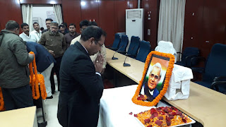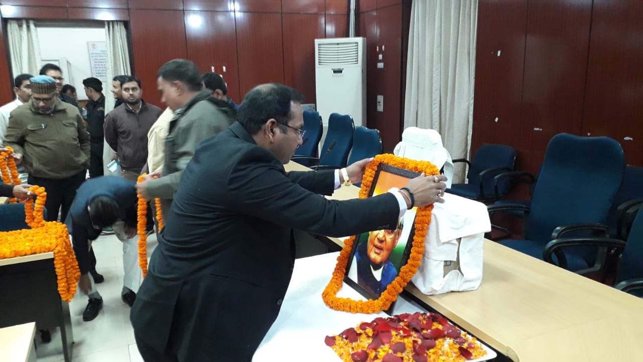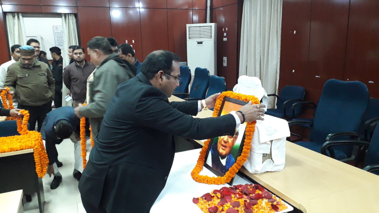 गया : भारत के पूर्व प्रधानमंत्री भारत रत्न स्वर्गीय अटल बिहारी वाजपेई की जयंती के अवसर पर समाहरणालय सभाकक्ष में उनकी प्रतिमा पर जिलाधिकारी अभिषेक सिंह ने माल्यार्पण कर अपनी श्रद्धांजलि अर्पित की। उप विकास आयुक्त किशोरी चौधरी, उप निदेशक जन संपर्क नागेन्द्र कुमार गुप्ता, जिला नजारत उप समाहर्ता मोहम्मद इजतबा हुसैन, सामान्य शाखा के प्रभारी उप समाहर्ता रविशंकर शर्मा, समाजसेवी मोती करीमीलएवं समाहरणालय के कर्मचारीगण ने माल्यार्पण कर उन्हें श्रद्धा सुमन अर्पित किये।