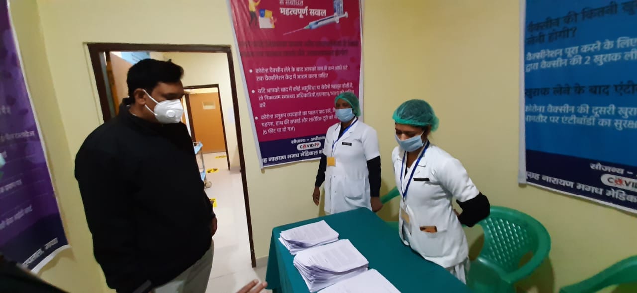 गया : कोविड-19 टीकाकरण का शुभारंभ आयुक्त मगध प्रमंडल, गया श्री मयंक बरबड़े द्वारा अनुग्रह नारायण मगध मेडिकल कॉलेज एवं अस्पताल, गया में किया गया। आयुक्त मगध प्रमंडल, गया द्वारा अनुग्रह नारायण मगध मेडिकल कॉलेज एवं अस्पताल में बनाये गये कोविड-19 सत्र स्थल का शुभारंभ/ उदघाटन फीता काटकर किया गया। इसके उपरांत उन्होंने टीकाकरण हेतु बनाये गये वेटिंग हॉल का उद्घाटन के दीप प्रज्वलन कर किया।