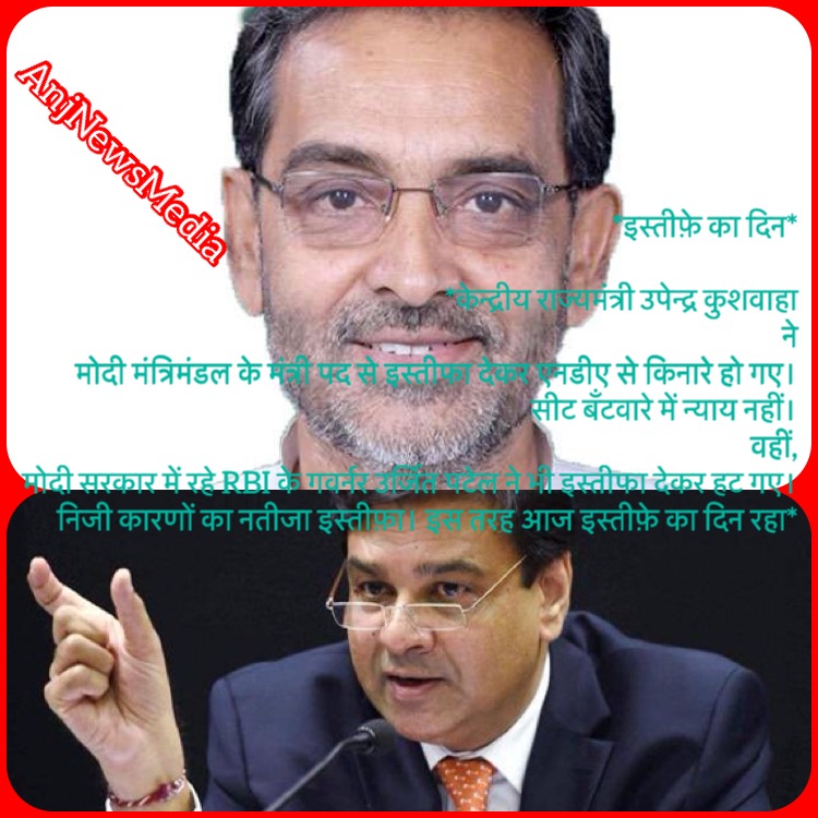 *केन्द्रीय राज्यमंत्री उपेन्द्र कुशवाहा ने मोदी मंत्रिमंडल के मंत्री पद से इस्तीफा देकर एनडीए से किनारे हो गए। सीट बँटवारे में न्याय नहीं। वहीं, मोदी सरकार में रहे RBI के गवर्नर उर्जित पटेल ने भी इस्तीफा देकर हट गए। निजी कारणों का नतीजा इस्तीफ़ा। इस तरह आज इस्तीफ़े का दिन रहा*