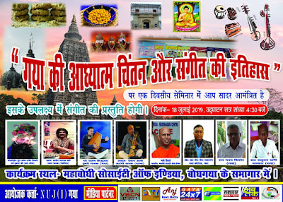 गया : बोधगया में एक दिवसीय सेमिनार का आयोजन 18 जुलाई को संध्या साढे चार बजे आयोजित होगी। सेमिनार का विषय है ‘गया की आध्यात्म चिंतन और संगीत की इतिहास’। सेमिनार में जाने- माने संगीत और आध्यात्म के मर्मज्ञ शिरकत करेंगे। उक्त ससेमिनार महाबोधि सोसाइटी ऑफ़ इंडिया के सभागार में होना है, जिसकी पूरी तैयारी जारी है। व्यापक पैमाने पर गया का आध्यात्म और संगीत की इतिहास पर गहन चिंतन- विमर्श किया जायेगा। उक्त आयोजन में कई मीडिया पार्टनर शामिल हैं। जिसमें NUJ(I) की मुख्य भूमिका है।