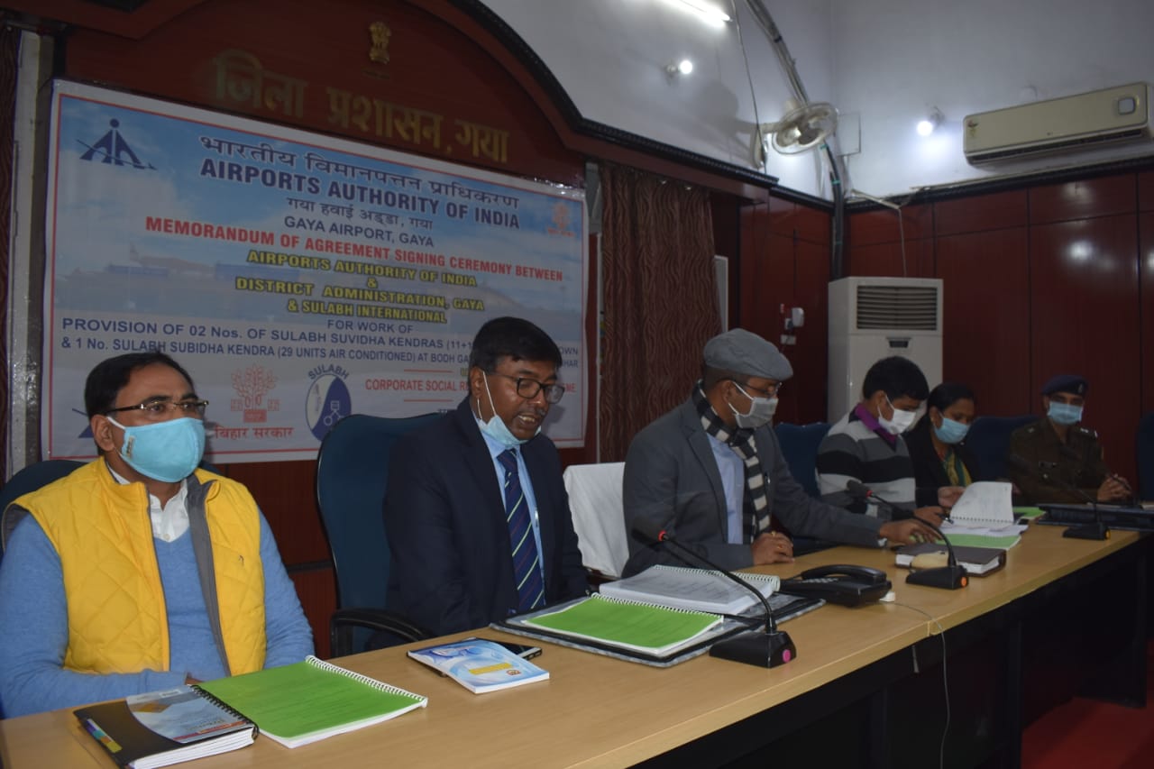 कार्यक्रम में बताते हुए भारतीय विमानपत्तन निदेशक गया श्री दिलीप कुमार ने कहा कि भारतीय विमानपत्तन प्राधिकरण एवं जिला प्रशासन के तत्वाधान में भारतीय विमानपत्तन प्राधिकरण के निगमित सामाजिक दायित्व कॉरपोरेट सोशल रिस्पांसिबिलिटी के अंतर्गत गया शहर के कठोकर तालाब के नजदीक सुलभ सुविधा केंद्र 11 यूनिट, टमटम पड़ाव के नजदीक 11 यूनिट एवं बोधगया टेंपल टाउन के कालचक्र मैदान के नजदीक 29 यूनिट सोलर ऊर्जा युक्त वातानुकूलित सुलभ सुविधा केंद्र की स्थापना हेतु जिला पदाधिकारी गया, भारतीय विमानपत्तन प्राधिकरण एवं जिला प्रशासन के वरिष्ठ अधिकारी की उपस्थिति में भारतीय विमानपत्तन प्राधिकरण, सुलभ इंटरनेशनल सोशल सर्विस ऑर्गेनाइजेशन एवं जिला प्रशासन के मध्य एक त्रिपक्षीय मेमोरेंडम ऑफ एग्रीमेंट का आयोजन किया गया। इस अवसर पर निदेशक विमानपत्तन, सुलभ इंटरनेशनल सोशल सर्विस ऑर्गेनाइजेशन के मानद अपर नियंत्रक श्री जय प्रकाश झा, जिला प्रशासन की ओर से नगर आयुक्त गया नगर निगम श्री सावन कुमार तथा नगर पंचायत बोधगया की ओर से कार्यपालक पदाधिकारी ने एग्रीमेंट पर हस्ताक्षर किया।