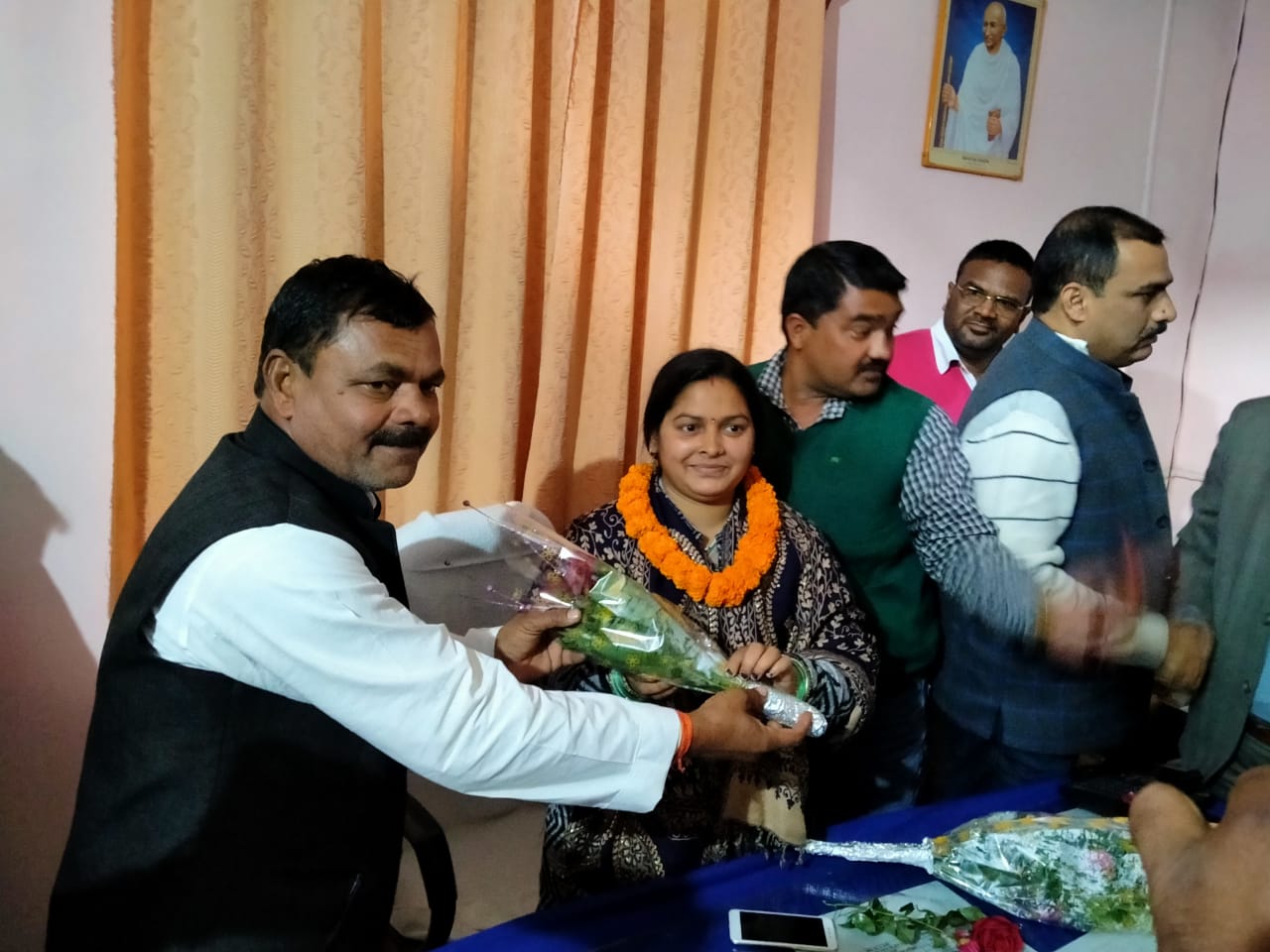| जीप अध्यक्ष पद पर पुन: बहाल हुईं करूणा देवी ताजपोशी उपरांत गर्मजोशी के साथ स्वागत करते पार्षद |