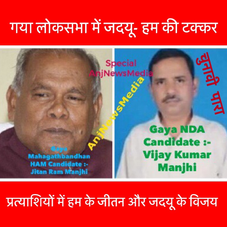 गया लोकसभा क्षेत्र से जदयू के विजय और हम के जीतन में चुनावी घमासान। चुनावी अखाड़े में दोनों प्रत्याशी ज़ोर आज़माईश में जुटे हैं। चुनावी तापमान के साथ हीं प्रचार का भी पारा चढ़ गया है। देखना है आमने- सामने की टक्कर में कौन प्रत्याशी सफलता पाते हैं। एनडीए के प्रत्याशी हैं विजय कुमार तथा महागठबंधन के उम्मीदवार हैं जीतनराम माँझी।