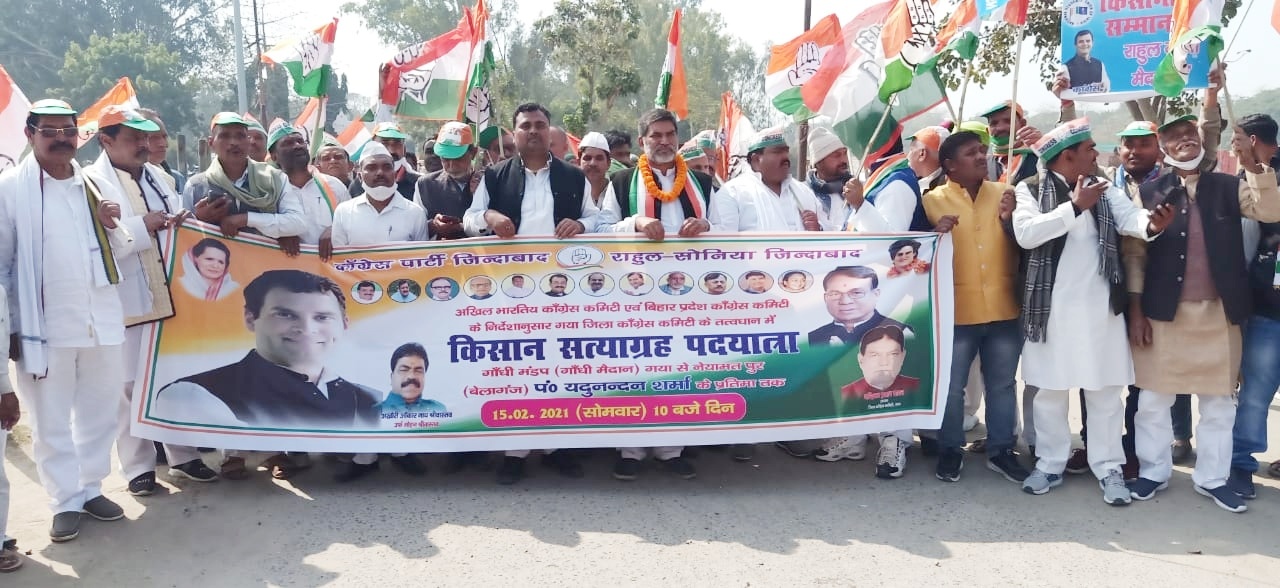 किसान सत्याग्रह पदयात्रा में पूर्व मंत्री अवधेश कुमार सिंह, अखिल भारतीय कांग्रेस कमिटी के सदस्य सह मगध प्रमंडल कांग्रेस प्रवक्ता प्रो विजय कुमार मिठू, गया जिला कांग्रेस अध्यक्ष चंद्रिका प्रसाद यादव, उपमहापौर मोहन श्रीवास्तव, डॉ शशि शेखर,सुमंत कुमार, बाबूलाल प्रसाद सिंह, अमरजीत कुमार, अमित कुमार उर्फ रिंकू सिंह, ओंकार नाथ सिंह,राम प्रमोद सिंह, युगल किशोर सिंह, विद्या शर्मा, लाचछो देवी, मदीना खातून, मिंटा देवी, अशोक सिंह, कृष्णा सिंह, बबलू कुमार, विशाल कुमार, मो सरवर खान, मो अजहरुद्दीन, मो नवाब अली, शैलेश चौधरी, रंजीत सिंह, दामोदर गोस्वामी, राम विनय शर्मा, अजित सिंह, वीरेंद्र कुमार बीरू, नवल किशोर शर्मा, बालमुकुंद पांडेय, टिंकू गिरी, नाजिर खान,दिलीप सिंह, आदि सैकड़ों नेता, कार्यकर्ता, किसान, मजदूर, युवा, छात्र आमजन शामिल हों कर किसान विरोधी कानून वापस लेना होगा, किसान, मजदूर युवा छात्र आमजन जिंदाबाद के गगनभेदी नारो को बुलंद करते हुए चल रहे थे।