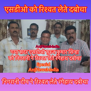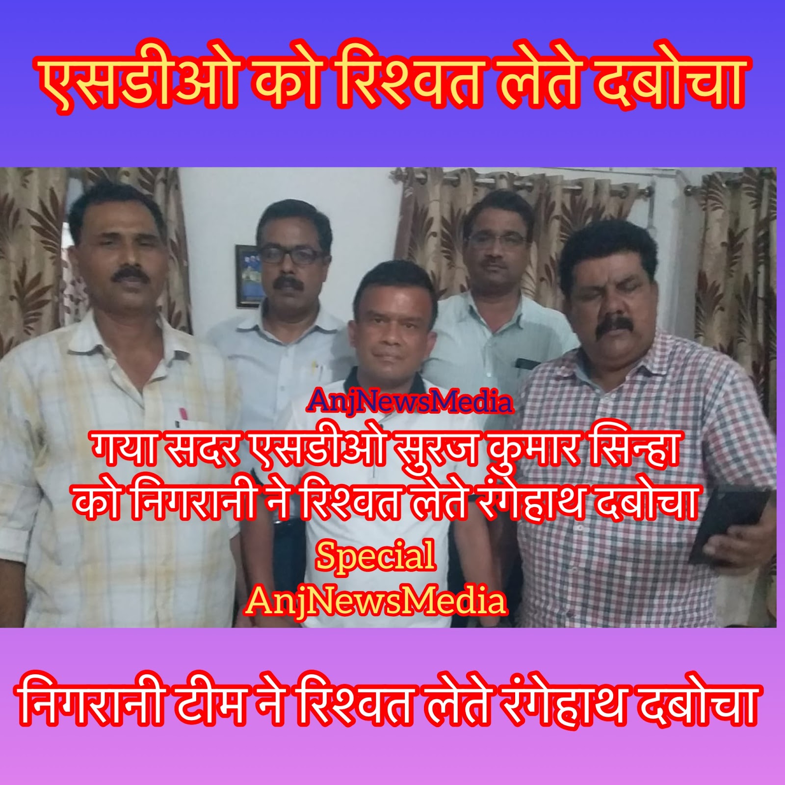 गया : सदर एसडीओ सूरज कुमार सिन्हा को 2 लाख रुपये घूस लेते निगरानी की टीम ने की गिरफ्तार। विदित हो पटना से आई विजलेंस की टीम ने उनके सरकारी आवास पर 2 लाख रुपये घूस लेते रंगेहाथ दबोचा।