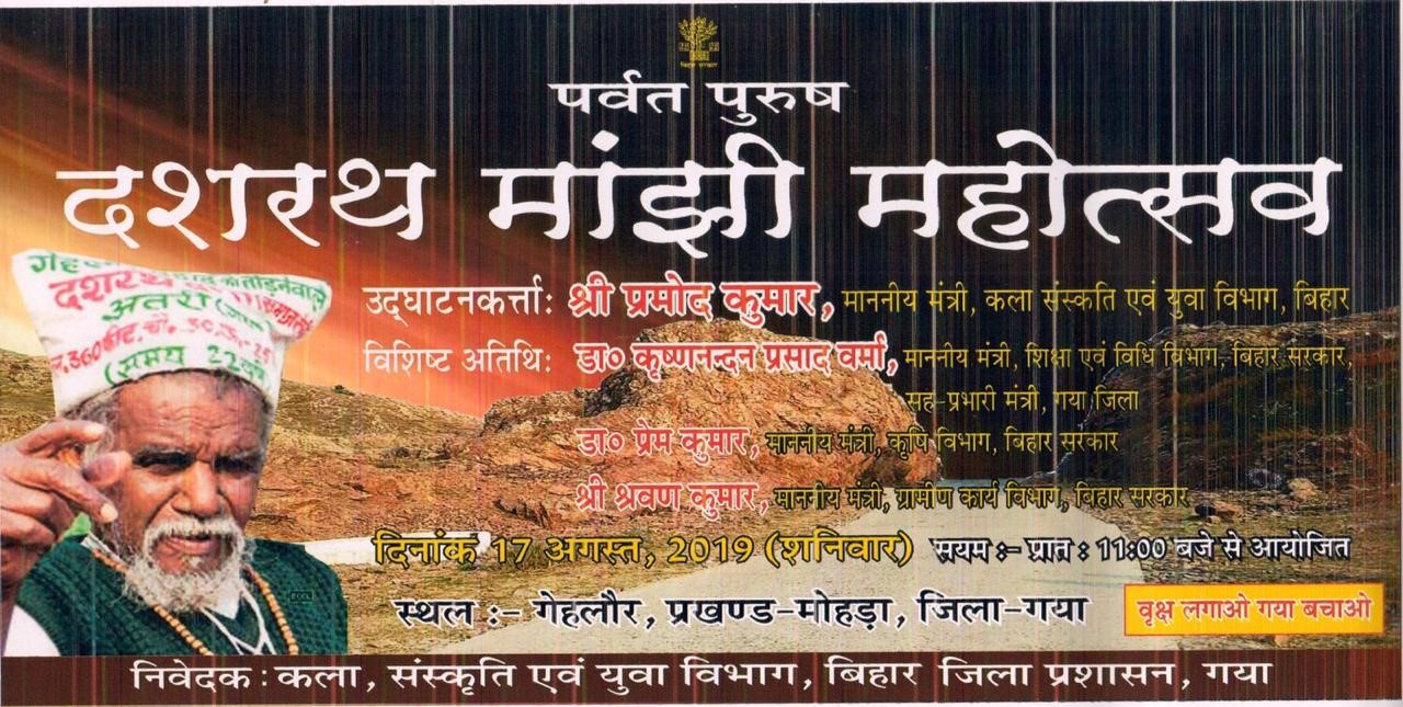 गेहलौर में पर्वत पुरूष दशरथ माँझी महोत्सव कल यानि 17 अगस्त को, तैयारी पूरी। इस महोत्सव का उद्घाटन कला-संस्कृति एवं युवा विभाग मंत्री प्रमोद कुमार करेंगे। इस महोत्सव का विशिष्ट अतिथि होंगे शिक्षा मंत्री कृष्णनंदन प्रसाद वर्मा, ग्रामीण विकास मंत्री श्रवण कुमार तथा कृषि मंत्री प्रेम कुमार। कलाकारों की मनमोहक सांस्कृतिक कार्यक्रम होगा, जी इस प्रकार है :-