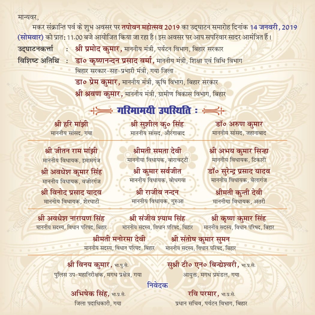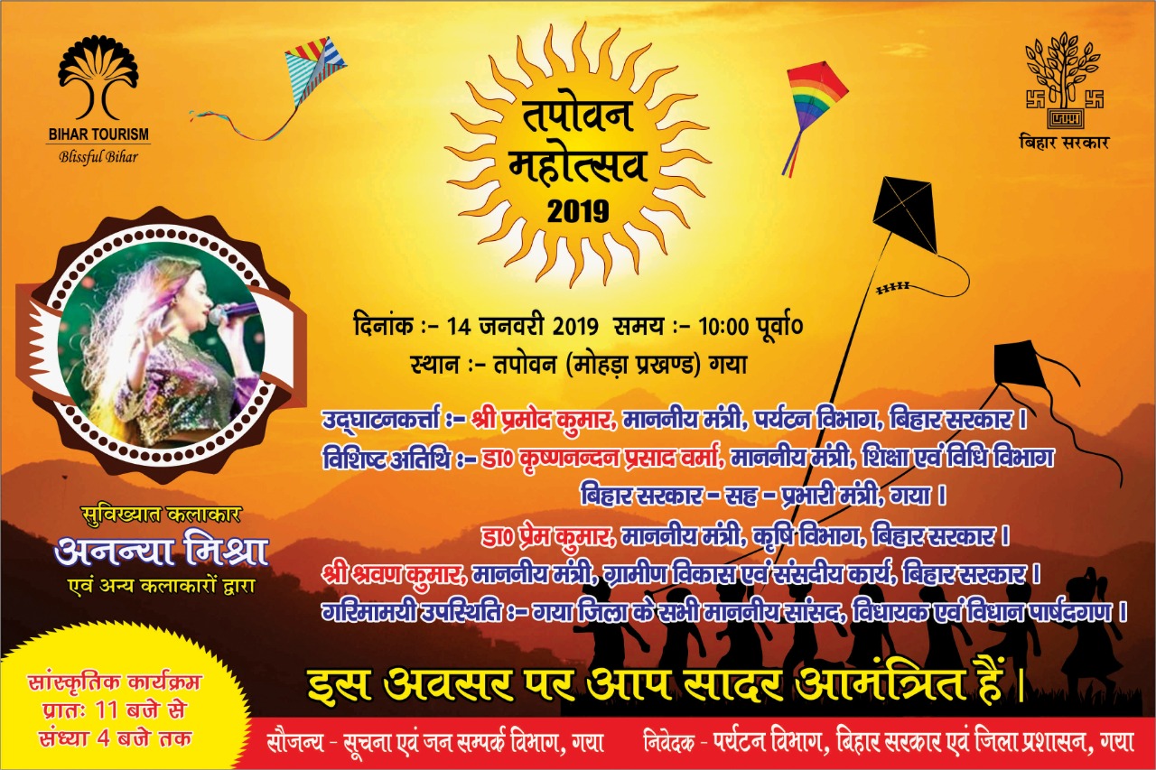 गया : जिले के ख़ूबसूरत प्रकृति के सुरम्य वादियों में आगामी 14 जनवरी को ‘तपोवन महोत्सव’ में कलाकारों की शानदार, जानदार अदा की प्रस्तुति से सजेगी महफ़िल :- अनन्या मिश्रा, इंडियन आँड्ल, रूपम रम्या, नीतू कुमारी, नवगीत, सत्येन्द्र कुमार, संगीत, विजय कुमार सिंह, लोक गायक, मगध संगीत संस्थान, लोक नृत्य तथा एस कुमार म्यूज़िकल शो। लोग झूमेंगे, गायेंगे। तपोवन महोत्सव का आनंद लेंगे लोग, श्रोताओं। समझो, महोत्सव का मस्त मजा। इस महोत्सव का उद्घाटन पर्यटन मंत्री प्रमोद कुमार करेंगे। विशिष्ट अतिथि के रूप में मौके पर गरिमामयी उपस्थिति होगी शिक्षा- विधि मंत्री कृष्णनंदन प्रसाद वर्मा, कृषि मंत्री प्रेम कुमार तथा ग्रामीण विकास मंत्री श्रवण कुमार की तथा प्रशासनिक पदाधिकारियों, सांसद सहित विधायक एवं स्थानीय जन प्रतिनिधियों की भागीदारी होगी।