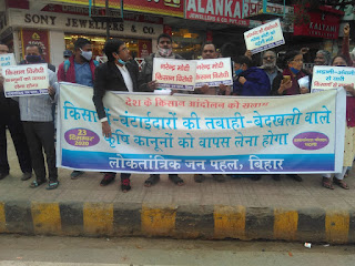 बिहार के किसानों पर भी इन कानूनों का खतरनाक असर पड़ने वाला है। लेकिन भाजपा के मुखौटा मुख्यमंत्री नीतीश कुमार प्रधानमंत्री श्री नरेन्द्र मोदी का राग अलाप रहे हैं। लोकतान्त्रिक जन पहल के कोर ग्रुप की बैठक में किसान आंदोलन के प्रति एकजुटता