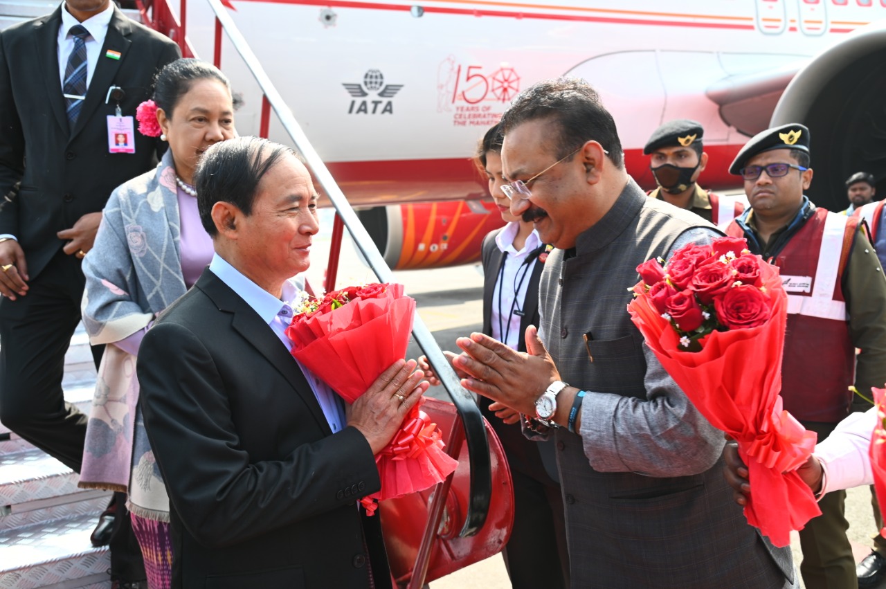 गया अंतरराष्ट्रीय हवाई अड्डा पर बिहार सरकार के भवन निर्माण मंत्री अशोक चौधरी, गया के सांसद विजय कुमार, आयुक्त मगध प्रमंडल गया असंगबा चुबा आओ, पुलिस महानिरीक्षक मगध क्षेत्र राकेश राठी, जिलाधिकारी अभिषेक सिंह, वरीय पुलिस अधीक्षक राजीव मिश्रा, विमानपत्तन निदेशक दिलीप कुमार द्वारा पुष्प गुच्छ प्रदान कर उनका हार्दिक अभिनंदन किया गया। महामहिम राष्ट्रपति के साथ उनकी धर्मपत्नी दाउ चो चो तथा 28 सदस्यीय प्रतिनिधि मंडल, जिनमें 3 कैबिनेट मिनिस्टर और एक रखेन स्टेट के मुख्यमंत्री शामिल थे। इस अवसर पर डीपीएस स्कूल के छात्राओं द्वारा पारंपरिक सांस्कृतिक कार्यक्रम के माध्यम से महामहिम राष्ट्रपति का अभिनंदन किया।