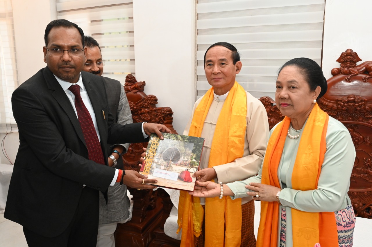 महाबोधि मंदिर के स्वागत कक्ष में सरकार की ओर से जिलाधिकारी अभिषेक सिंह ने उनका स्वागत किया तथा कहा कि म्यांमार से बड़ी संख्या में बौद्ध श्रद्धालु एवं पर्यटक गया आते हैं। जिलाधिकारी ने बोधगया के बारे में जानकारी देते हुए कहा कि बिहार के मुख्यमंत्री नीतीश कुमार बोधगया के विकास में व्यक्तिगत रुचि रखते हैं। बोधगया में एक विश्व स्तरीय कन्वेंशन हॉल बनाया जा रहा है। इसके अतिरिक्त महाबोधि मंदिर के डेवलपमेंट के लिए बोधगया टेंपल मनेजमेंट कमिटी बनाया गया है। हमारी कोशिश रहती है कि बाहर से जो भी श्रद्धालु एवं पर्यटक आते हैं उन्हें बेहतर से बेहतर सुविधा प्रदान किया जा सके। इस अवसर पर भवन निर्माण मंत्री अशोक चौधरी ने महामहिम राष्ट्रपति म्यंमार को महाबोधि मंदिर का स्मृति चिन्ह प्रदान किया, गया के सांसद विजय कुमार ने उनकी धर्मपत्नी म्यंमार की प्रथम महिला श्रीमती दावो चो चो को बुद्ध की प्रतिमा का स्मृति चिन्ह प्रदान किया, जिलाधिकारी अभिषेक सिंह ने गया कॉफी टेबल बुक तथा महाबोधि वृक्ष का पत्ता प्रदान किया, आयुक्त मगध प्रमंडल द्वारा म्यांमार के तीनों कैबिनेट मिनिस्टर एवं मुख्यमंत्री को महाबोधि मंदिर के स्मृति चिन्ह प्रदान किया।