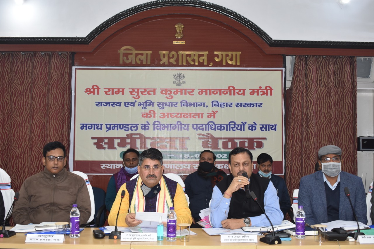 गया : माननीय मंत्री राजस्व एवं भूमि सुधार तथा विधि विभाग बिहार सरकार श्री राम सूरत कुमार की अध्यक्षता में राजस्व एवं भूमि सुधार से संबंधित विषयों पर प्रमंडल स्तरीय समीक्षा बैठक का आयोजन समाहरणालय सभाकक्ष में किया गया।