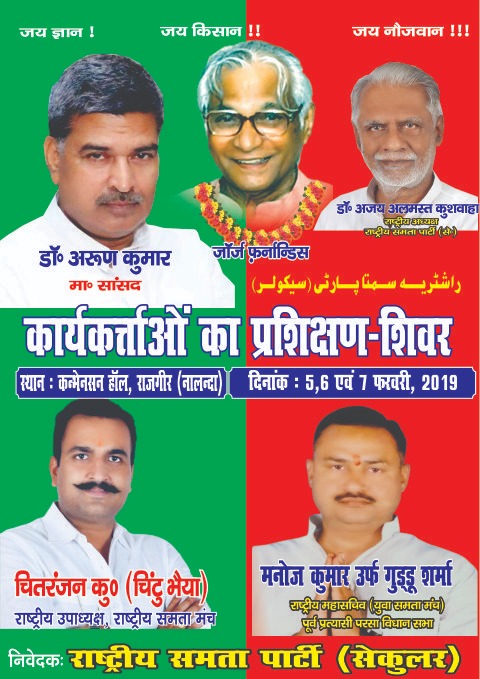 राष्ट्रीय समता पार्टी (से.) का राजगीर में आयोजित होगी तीन दिवसीय शिविर