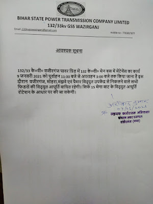 गया : सहायक कार्यपालक अभियंता, संचरण अवर प्रमंडल ने बताया132/33 के ०वी० वजीरगंज पावर ग्रिड में 132 के०वी० मेन बस में मेंटेनेंस का कार्य 9 जनवरी 2021 को पूर्वाहन 11:00 बजे से अपराहन 3:00 बजे तक किया जाना है इस दौरान वजीरगंज, फतेहपुर,मोहरा एवं पैमार विद्युत उपकेंद्र से निकलने वाले सभी फिडरों की विद्युत आपूर्ति बाधित रहेगी। सिर्फ 15 मेगा वाट के विद्युत आपूर्ति रोटेशन के आधार पर की जा सकेगी।