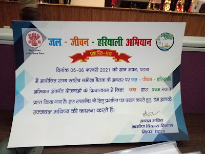 जल जीवन हरियाली अभियान के सभी 11 अवयवों के क्रियान्वयन में निरंतर उत्कृष्ट कार्य करने एवं योजनाओं को ससमय पूरा करने हेतु दिनांक 5 एवं 6 फरवरी, 2021 को ज्ञान भवन, पटना में आयोजित राज्य स्तरीय समीक्षा बैठक के अवसर पर गया जिला को यह पुरस्कार प्राप्त हुआ है।