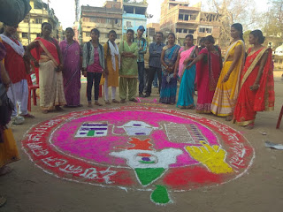 गया : लोक सभा आम निर्वाचन 2019 के चुनाव में मतदान तिथि को मतदाताओं का मतदान सुनिश्चित कराने हेतु स्वीप के अंतर्गत मतदाता जागरूकता कार्यक्रम *रंगोली बनाओ प्रतियोगिता* का आयोजन आजाद पार्क गया में किया गया। इस कार्यक्रम का उद्घाटन योगेश कुमार सागर, सहायक समाहर्ता के कर कमलों से दीप प्रज्वलित कर किया गया। इस अवसर पर उप निदेशक जनसंपर्क श्री नागेंद्र कुमार गुप्ता ने सहयोग किया। इस अवसर पर उपस्थित प्रतिभागियों एवं दर्शकों को संबोधित करते हुए सागर ने कहा कि 11 अप्रैल 2019 को गया में लोकतंत्र का महापर्व आयोजित है आप सभी भारी संख्या में अपने मतदान केंद्र पर पहुंचकर मतदान करें। प्रशासन द्वारा सुरक्षा एवं सुविधा की मुकम्मल व्यवस्था की गई है। उन्होंने कहा कि निर्वाचन से संबंधित सभी प्रकार की जानकारी प्राप्त करने के लिए टॉल फ्री नम्बर 1950 का उपयोग करें। इस नंबर पर आपको निर्वाचन से संबंधित सारी जानकारी प्रदान की जाएगी साथ ही भारत निर्वाचन आयोग ने निर्वाचन से संबंधित शिकायतों को दर्ज कराने के लिए सी विजिल एप्प का शुभारंभ किया है। इस एप्प पर कोई भी व्यक्ति निर्वाचन से संबंधित रिकार्डेड शिकायत दर्ज कर सकता है और प्राप्त शिकायत पर 20 मिनट के अंदर कार्रवाई करते हुए 45 मिनट के अंदर सारी प्रक्रिया पूरी करनी है। कार्यक्रम का संचालन नागेंद्र कुमार गुप्ता उप निदेशक जनसंपर्क ने किया। उन्होंने कहा कि अप्रैल के 11 तारीख को नाश्ता, खाना बाद में, पहले करें मतदान। घर के बुजुर्गों को भी, निःशक्त जनों को सवारी पर ले जाएं एवं कराएं मतदान। इस अवसर पर साक्षरता समूह, जीविका समूह, शहरी आजीविका समूह, बाल विकास परियोजना के सेविका सहायिका के पांच पांच ग्रुप कुल 20 ग्रुप द्वारा रंगोली बनाई गई। जिनमें ग्रुप एन के शक्ति समूह शहरी आजीविका तथा द्वितीय ग्रुप इ के साक्षरता समूह तथा तृतीय ग्रुप बी के साक्षरता समूह ने प्राप्त किया किया। इन समूहों को जिला स्तर पर प्रशस्ति पत्र प्रदान किया जाएगा।