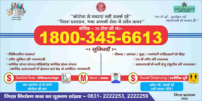 गया ज़िले में कोविड 19 के संक्रमण को फैलने से रोकने एवं जिलावासियों को मास्क का उपयोग, सामाजिक दूरी का अनुपालन तथा कोविड संक्रमण से बचाव हेतु ज़िला पदाधिकारी द्वारा 12 अप्रैल, 2021 से अगले आदेश तक गया ज़िले में सार्वजनिक स्थल, मॉल, दुकान, बाजार एवं अन्य स्थलों, यात्री बस तथा चारपहिया वाहन, तीनपहिया वाहनों यथा ऑटोरिक्शा पर मास्क के उपयोग का अनुपालन आवश्यक है।