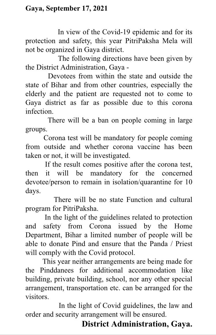 | गया जिला प्रशासन ने इस वर्ष कोविड संक्रमण के खतरे को देखते हुए पितृपक्ष मेला पर बैन लगा दी है : डीएम गया |