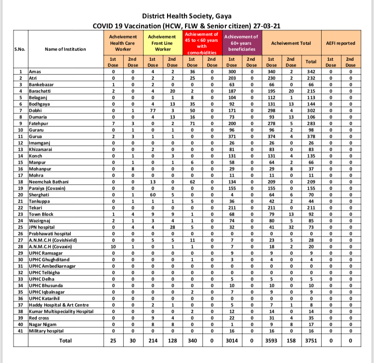 गया : कोविड 19 संक्रमण के बढ़ते प्रभाव को देखते हुए जिला प्रशासन, गया कोविड संक्रमण के बचाव एवं सुरक्षा हेतु और अधिक प्रभावी तरीके से जुट गया है। ज़िले में कोविड टीकाकरण तथा कोविड 19 की जांच को तेज करने का निदेश सिविल सर्जन तथा अधीक्षक, एएनएमएमसीएच को दिया गया है।
