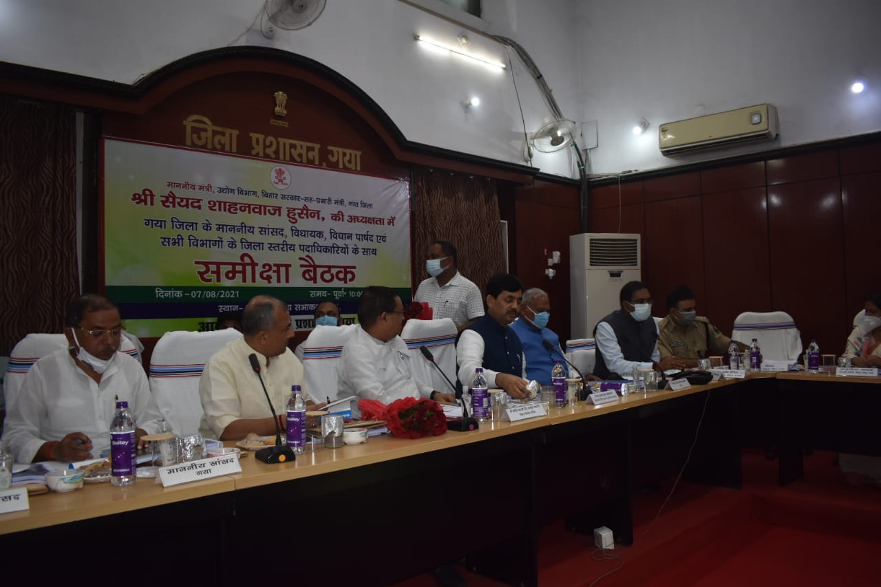 श्री सैयद शाहनवाज हुसैन, माननीय मंत्री उद्योग विभाग बिहार सरकार सह प्रभारी मंत्री गया जिला की अध्यक्षता में सरकार की कल्याणकारी योजनाओं के प्रगति की समीक्षा बैठक समाहरणालय सभाकक्ष में की गई। बैठक में माननीय सभापति बिहार विधानसभा परिषद, माननीय पूर्व मुख्यमंत्री श्री जीतन राम मांझी, माननीय सांसद गया, माननीय सांसद औरंगाबाद, माननीय नगर विधायक गया, सभी माननीय सदस्य बिहार विधान परिषद, माननीय विधायक गण, माननीय जिला परिषद अध्यक्षा तथा महापौर गया नगर निगम सहित अन्य जनप्रतिनिधि गण तथा जिला स्तरीय पदाधिकारी गण उपस्थित थे।