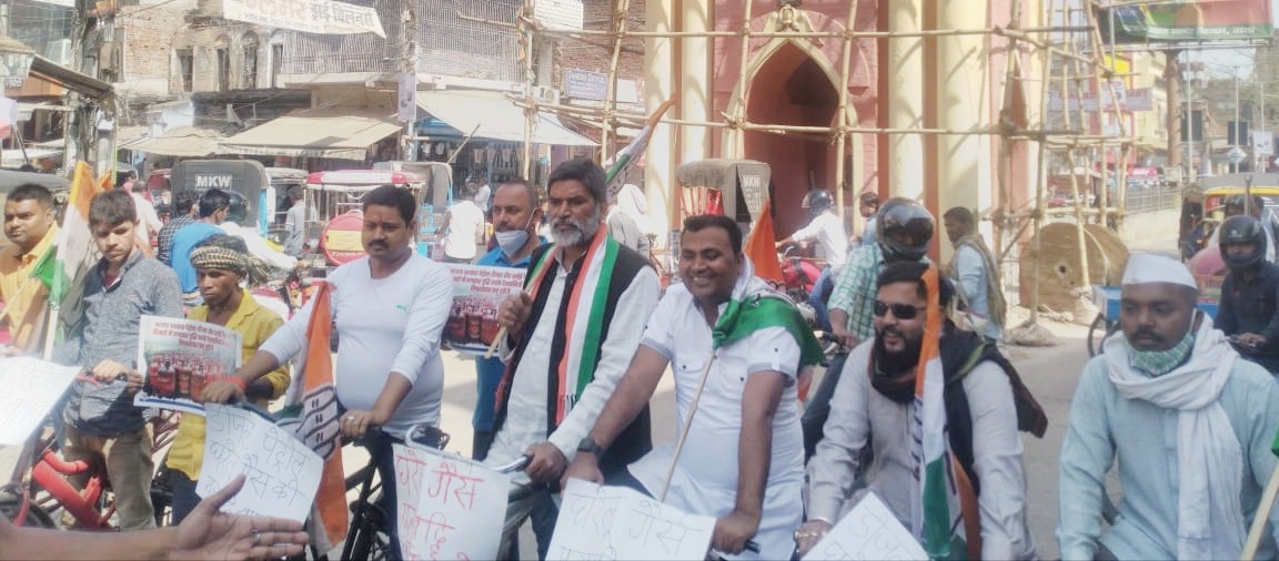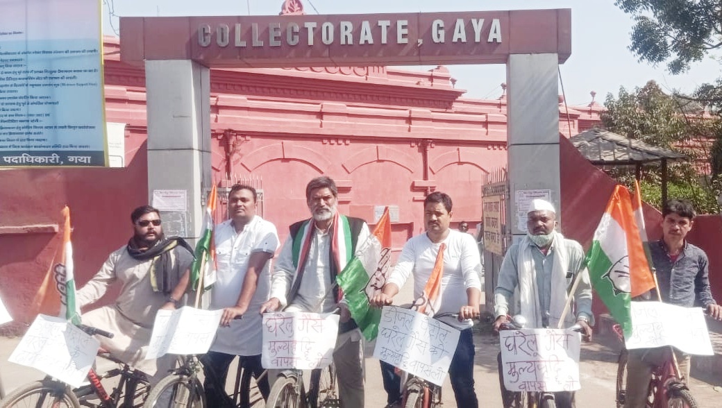 गया : डीजल, पेट्रोल, घरेलू गैस के बेतहाशा price hike मूल्यवृद्धि के खिलाफ Congress Party के नेता कार्यकर्ता ने आज गया के स्थानीय गांधी चौक से साईकिल पर सवार होकर अपने, अपने हाथो में तख्तियां लेकर पूरे शहर में विरोध प्रदर्शन किया।