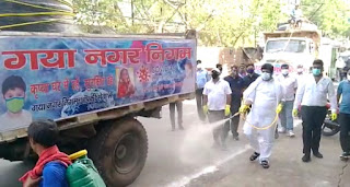 गया नगर निगम के मेयर गणेश पासवान एवं डिप्टी मेयर अखौरी ओंकारनाथ उर्फ मोहन श्रीवास्तव गया शहर के सड़कों पर उतर कर स्वयं सभी घरों को सेनेटाइज करने की शुरुआत की है ।इस मौके पर गया नगर निगम के कई कर्मचारी भी उनके साथ चलकर उन्हें मदद कर रहे हैं। इसकी शुरुआत गया स्टेशन के समीप नगर निगम स्टोर से शुभारंभ किया गया। इस मौके पर मेयर गणेश पासवान ने कहा कि बीते वर्ष की तरह इस वर्ष भी कोरोना महामारी को देखते हुए सैनिटाइज करने का काम किया जा रहा है। उन्होंने यह भी कहा कि नगर निगम के सभी कर्मचारी भी इस में बढ़ चढ़कर हिस्सा ले रहे हैं उन्होंने कहा कि नगर निगम का लक्ष्य है कि कोरोना महामारी के बढ़ते प्रकोप को रोक सके।जिससे हमारे शहरवासी सुरक्षित रहे। वहीं डिप्टी मेयर मोहन श्रीवास्तव ने कहा कि इसके पूर्व से भी सेंटाईजेशन का कार्य चल रहा था परंतु आज से एक अभियान के तहत इसकी शुरुआत की गई है जो अग्रसर चलता रहेगा उन्होंने कहा कि हमारे नगर निगम के कर्मचारी भी निरंतर इस कार्य में लगे हैं वह उन्होंने शहर के लोगों से अपील किया है कि कोरोनावायरस जैसी बीमारी से घबराने की आवश्यकता नहीं है बल्कि हम लोग एक साथ मिलकर इसका मुकाबला करें और ज्यादा घबराने की आवश्यकता नहीं है। हम लोग और पूरे नगर निगम के लोग शहर वासियों के साथ हैं।
