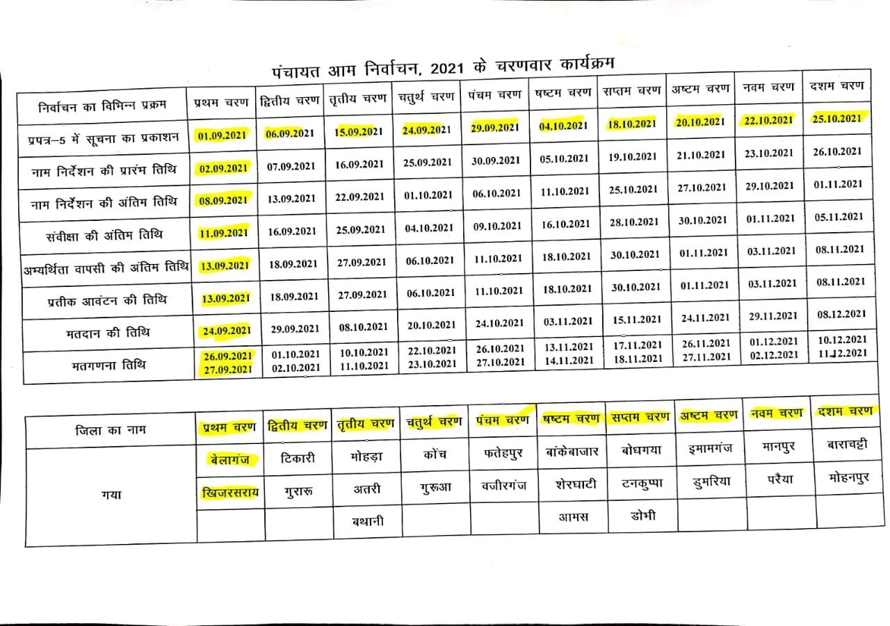 गया ज़िला में आगामी पंचायत चुनाव 24 सितंबर से 08 दिसंबर 2021 तक है कुल 10 चरणों में संपन्न किया जाएगा। गया जिले के प्रथम चरण में 24 सितंबर को बेलागंज एवं खिजरसराय प्रखंड में पंचायत चुनाव होगा, द्वितीय चरण में 29 सितंबर को टिकारी एवं गुरुआ में, तीसरा चरण 8 अक्टूबर मोहरा, अतरी एवं नीमचक बथानी प्रखंड में, चौथा चरण 20 अक्टूबर को कोच एवं गुरुआ में, पांचवा चरण 24 अक्टूबर को फतेहपुर एवं वजीरगंज में, छठा चरण 3 नवंबर को बांके बाजार, शेरघाटी एवं आमस में, सातवां चरण 15 नवंबर को बोधगया, टनकुप्पा एवं डोभी में, आठवां चरण 24 नवंबर को इमामगंज एवं डुमरिया में, नौवा चरण 29 नवंबर को मानपुर, परैया एवं नगर प्रखंड में तथा दसवां चरण 8 दिसंबर को मोहनपुर तथा बाराचट्टी में चुनाव संपन्न कराए जाएंगे।
