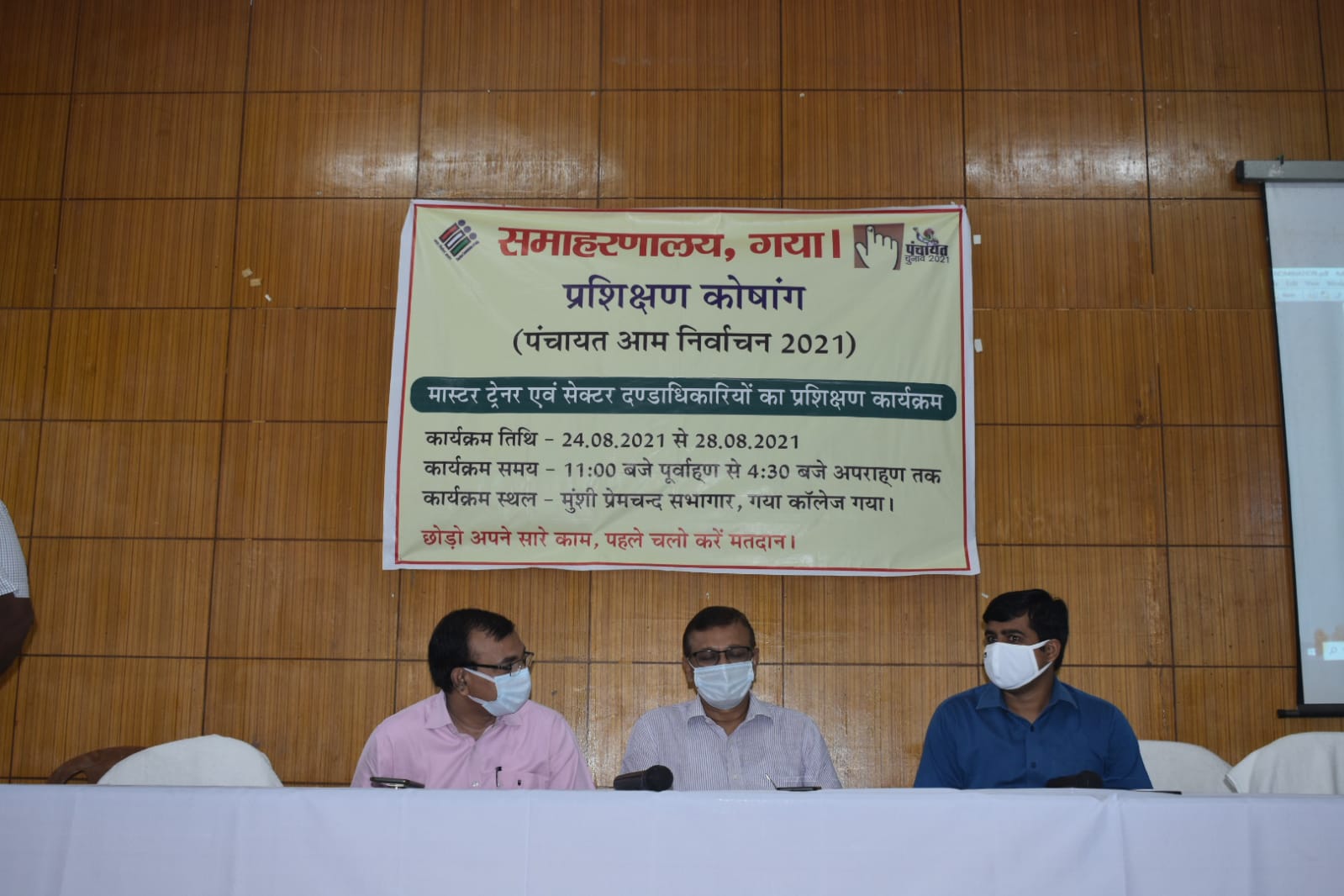 पंचायत आम निर्वाचन 2021 के अवसर पर मतदान पदाधिकारी / चुनाव कर्मियों यथा सेक्टर दंडाधिकारी, मतदान दल में प्रतिनियुक्त पीठासीन पदाधिकारियों/ कर्मियों को प्रशिक्षण हेतु विभिन्न शिक्षकों को, बी०आई०पी० तथा कनीय अभियंता को मास्टर ट्रेनर के रूप में नामित किया गया है। मास्टर ट्रेनर प्रशिक्षण दिनांक 24 अगस्त एवं 25 अगस्त को गया कालेज के मुंशी प्रेमचंद्र सभागार में दिया जा रहा है। आज 105 मास्टर ट्रेनरों का प्रशिक्षण शुरू हुआ।
