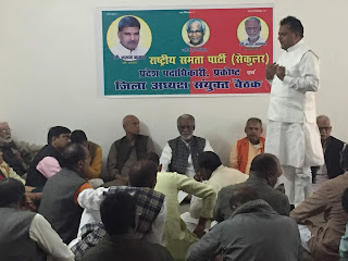 पटना : राष्ट्रीय समता पार्टी सेकुलर के राष्ट्रीय राष्ट्रीय अध्यक्ष अजय अलमस्त की अध्यक्षता में राष्ट्रीय समता पार्टी सेकुलर के प्रदेश पदाधिकारी, प्रकोष्ठ एवं ज़िलाध्यक्ष संयुक्त बैठक आरंभ हुआ। महारैली की सफलता के लिए प्रदेश अध्यक्ष ओमप्रकाश बिंद ने पार्टी के पदाधिकारियों को बधाई व धन्यवाद दिये। वर्तमान राजनैतिक पर समीक्षा चर्चा जारी। पार्टी के सभी प्रकोष्ट के पदाधिकारी बैठक में उपस्थित।