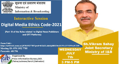 इसका उद्देश्य ओटीटी प्लेटफार्म और डिजिटल समाचार प्रकाशकों के लिए सूचना एवं प्रसारण मंत्रालय द्वारा बनाई गयी डिजिटल मीडिया आचार संहिता के बारे में जानकारी देना है। पत्र सूचना कार्यालय, पटना (रीजन) के अपर महानिदेशक एस के मालवीय ने बताया कि इस ई-बैठक को सूचना एवं प्रसारण मंत्रालय के संयुक्त सचिव श्री विक्रम सहाय संबोधित करेंगे। ई-बैठक का आयोजन 07 जुलाई, 2021 को दोपहर 3 से 5 बजे तक जूम प्लेटफार्म के माध्यम से किया जाएगा ।